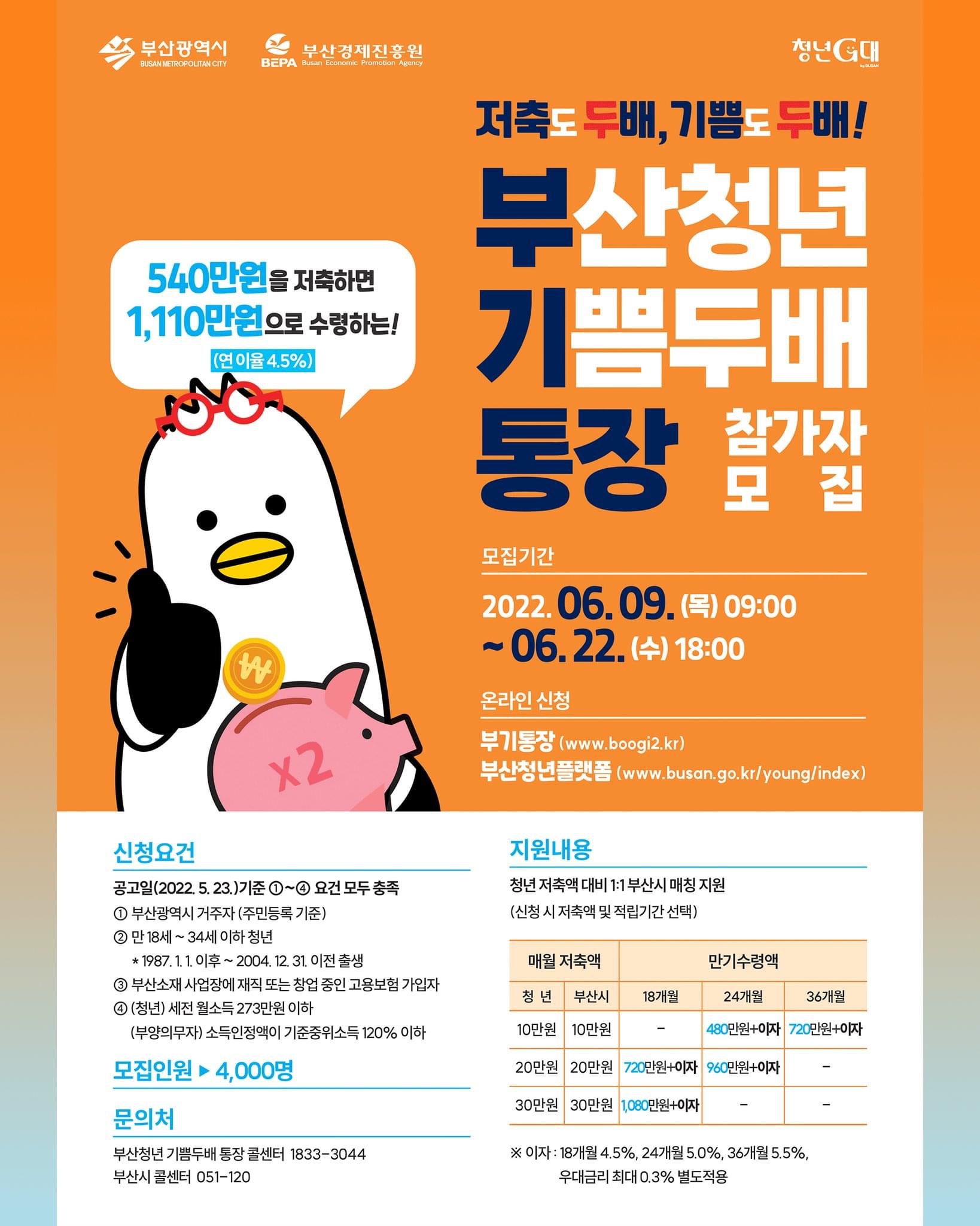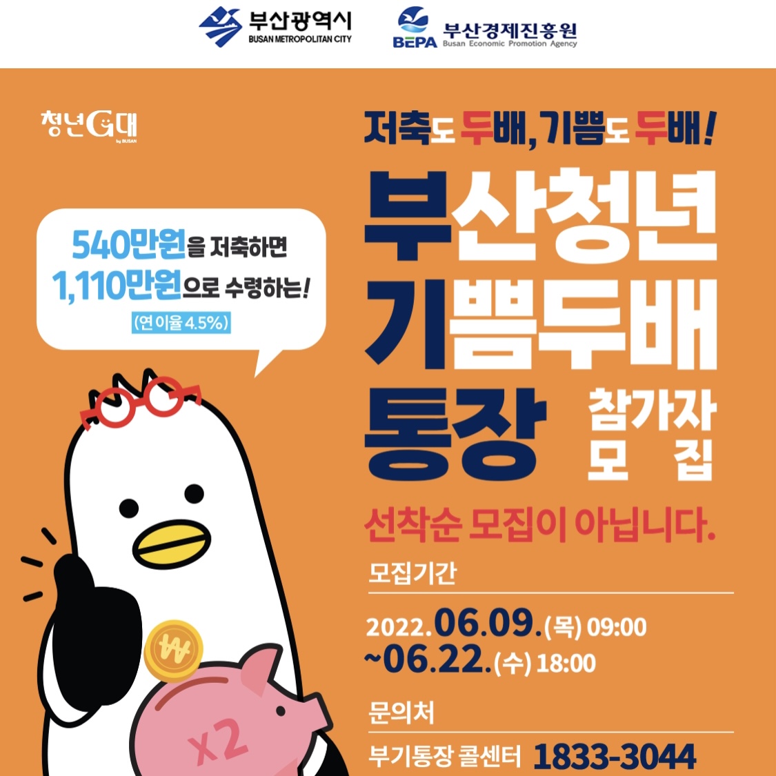 2022년 6월 9일부터 신청이 시작된 ‘부산청년 기쁨두배통장’은 부산시에서 일하는 청년들의 안정된 자산형성과 목돈 마련을 위해 부산은행과 협약을 맺어 출시되었습니다.
