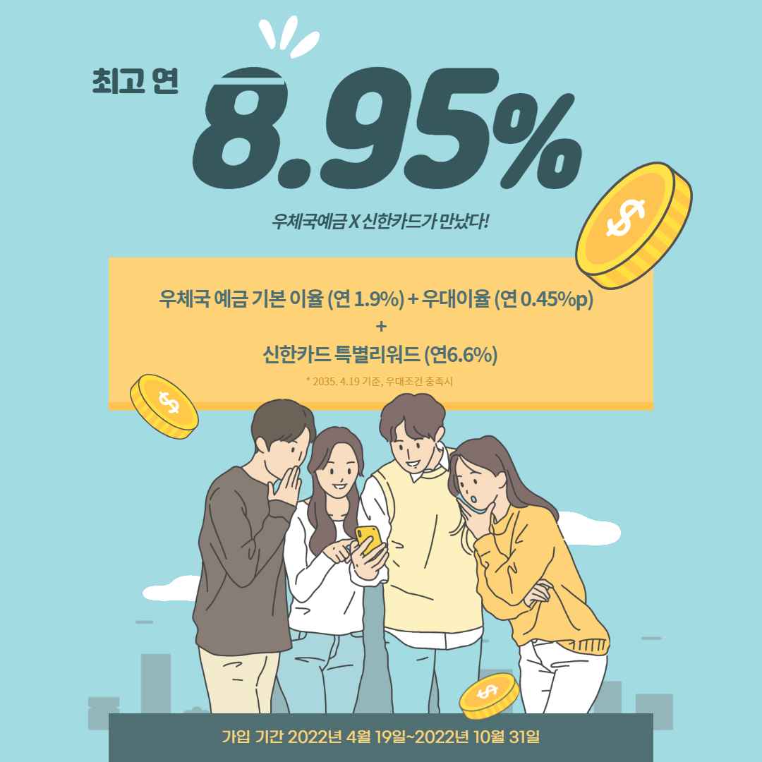 사회적 거리두기가 약 2년 1개월만에 해제가 되면서, 점차 일상으로 되찾아가는 기분이 듭니다. 초록초록 새순이 돋아나는 2022년 봄, 우체국예금과 신한카드가 만나 우체국 신한우정적금을 출시했습니다.