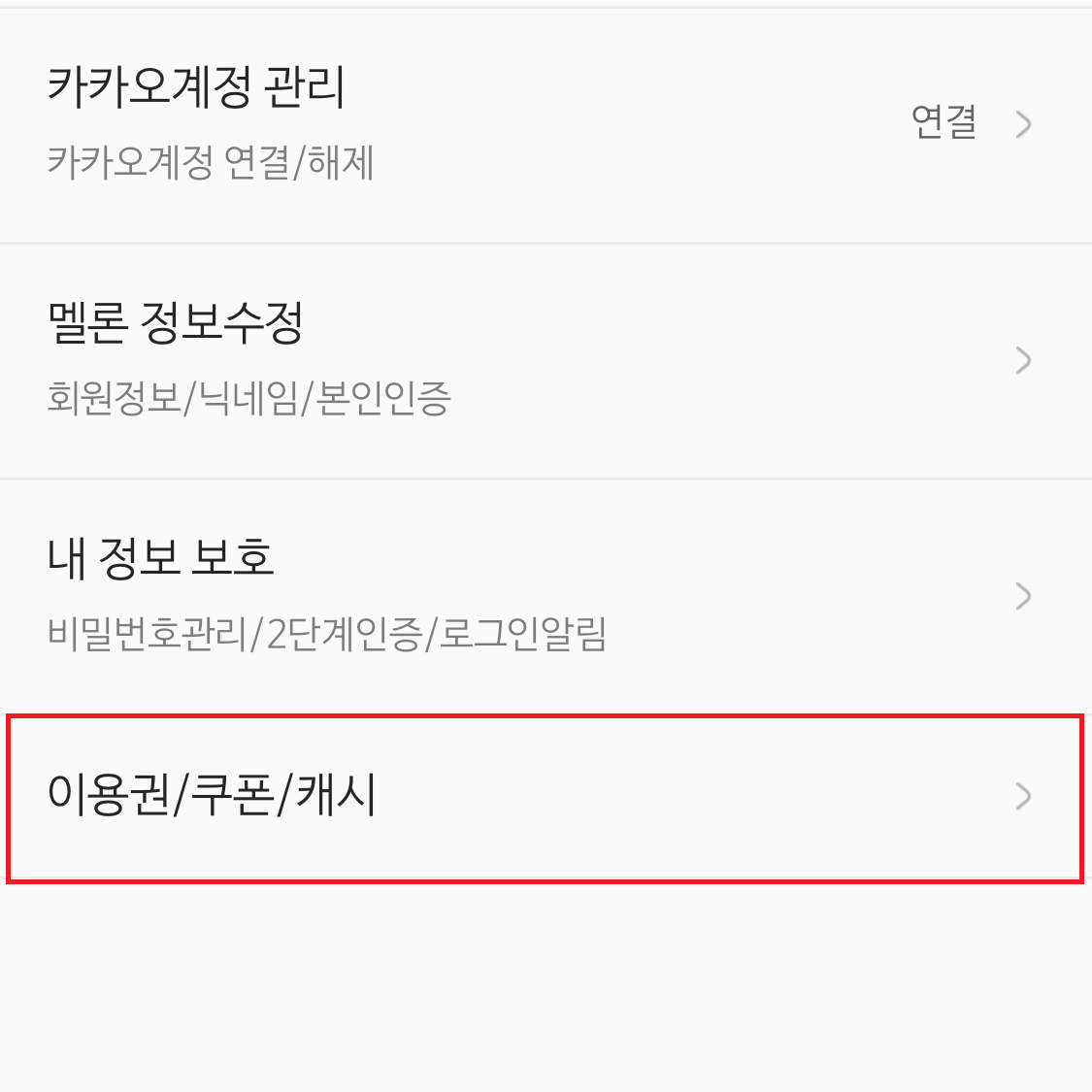 3. 내 정보의 [이용권/쿠폰/캐시] 선택