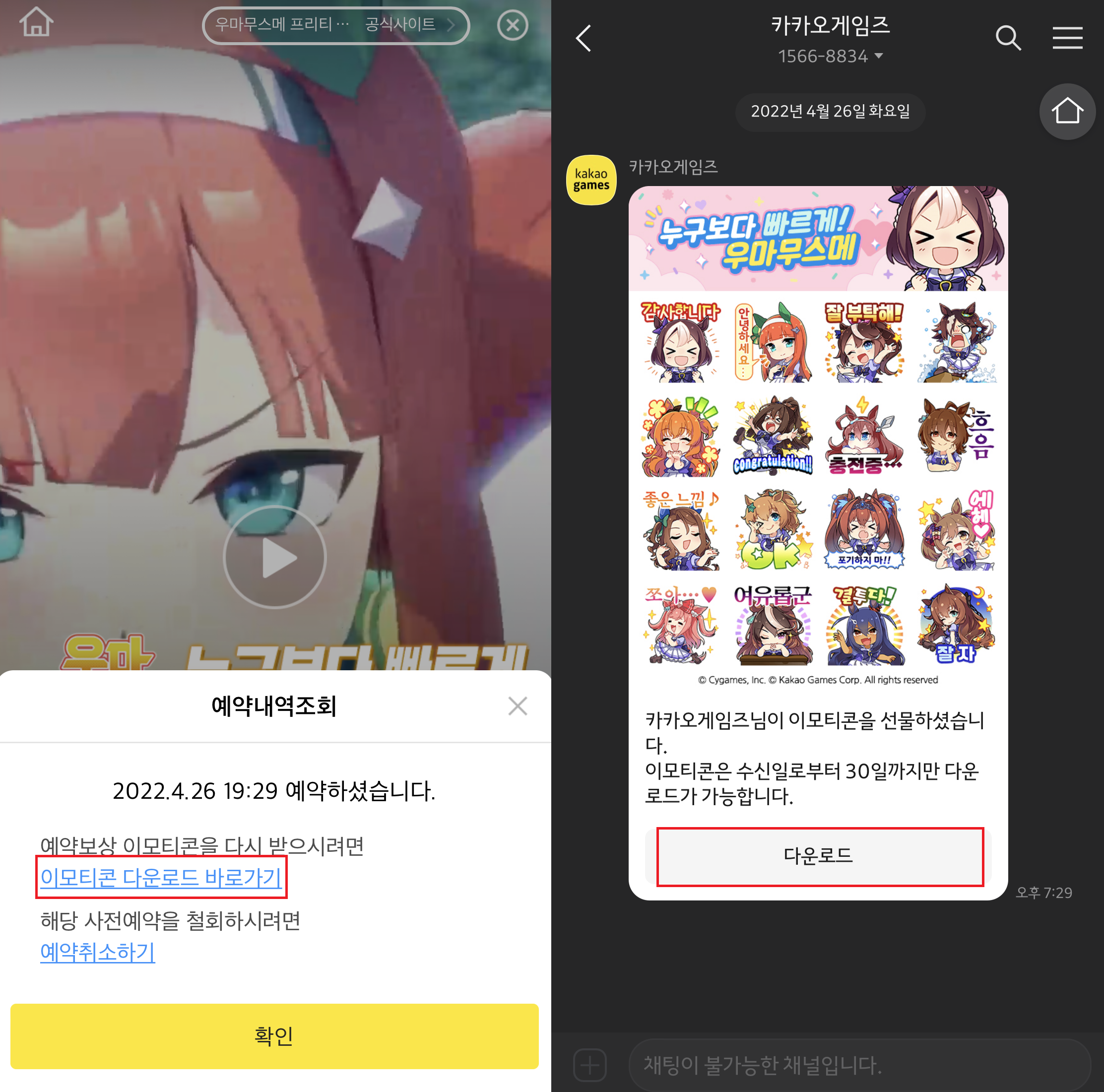 또 사전예약 시 깜찍한 우마무스메 카카오톡 이모티콘을 선물 받을 수 있습니다. 이모티콘 수신방법은 사전예약이 끝나면 "이모티콘 다운로드 바로가기"라는 예약보상 링크가 화면에 보입니다. 해당 링크를 누르면 바로 카카오톡으로 이모티콘 다운로드를 받을 수 있습니다. 물론 이벤트성이기 때문에 이모티콘의 사용기간은 수신 일자로부터 30일 기한 한정입니다.