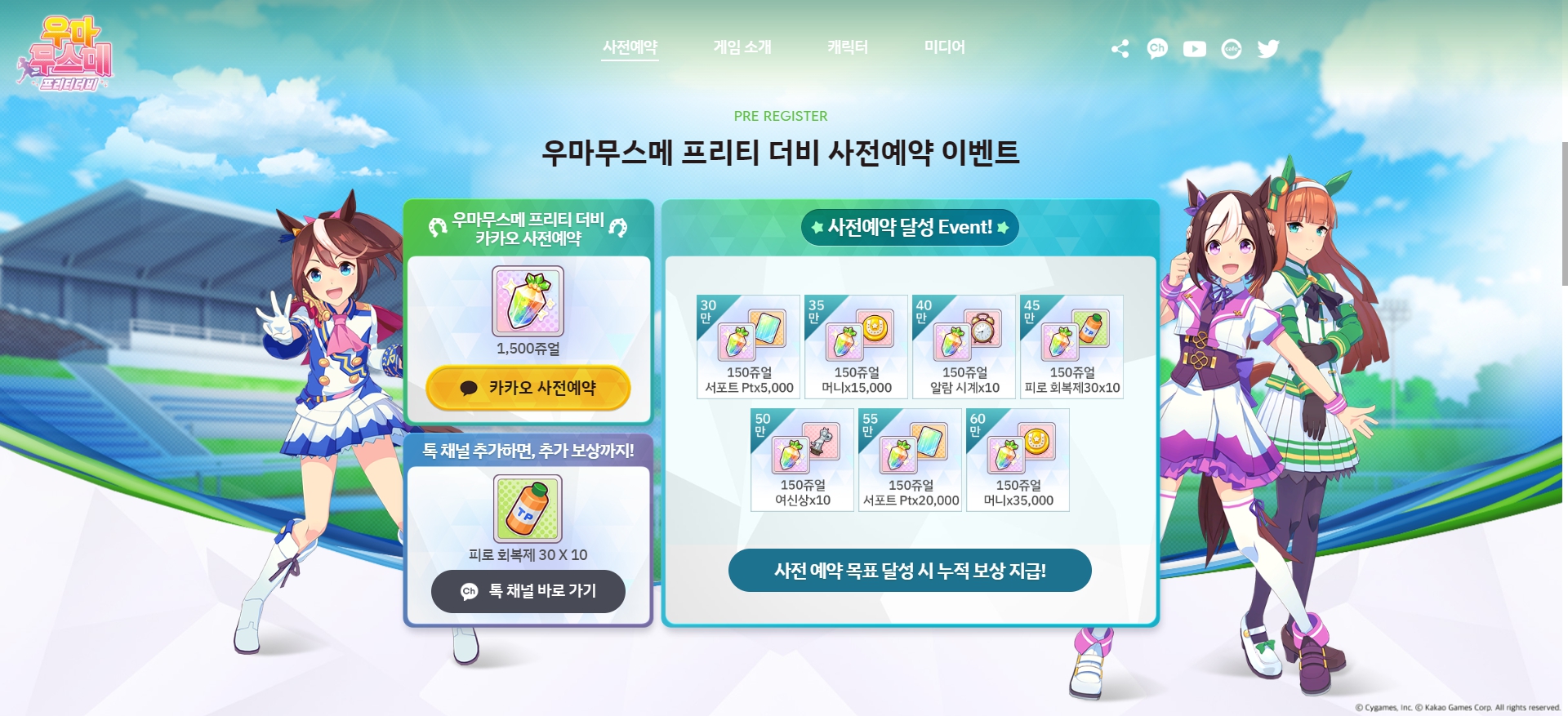 - 카카오톡 채널 추가 선물 : <우마무스메더비> 카카오톡 채널 추가시 인게임 아이템 '피로 회복제 30' X 10개 제공