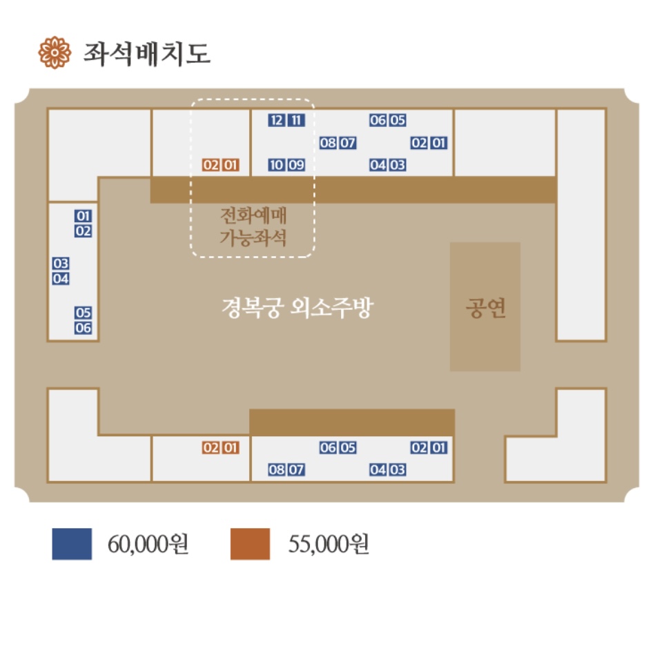 - 시야 제한석은 외소주방 내 공연 관람 시 시야가 일부 제한되는 좌석입니다. 좌석은 별빛야행 전체 프로그램 중 외소주방 내 궁중음식체험, 국악공연 관람 시에만 지정됩니다.