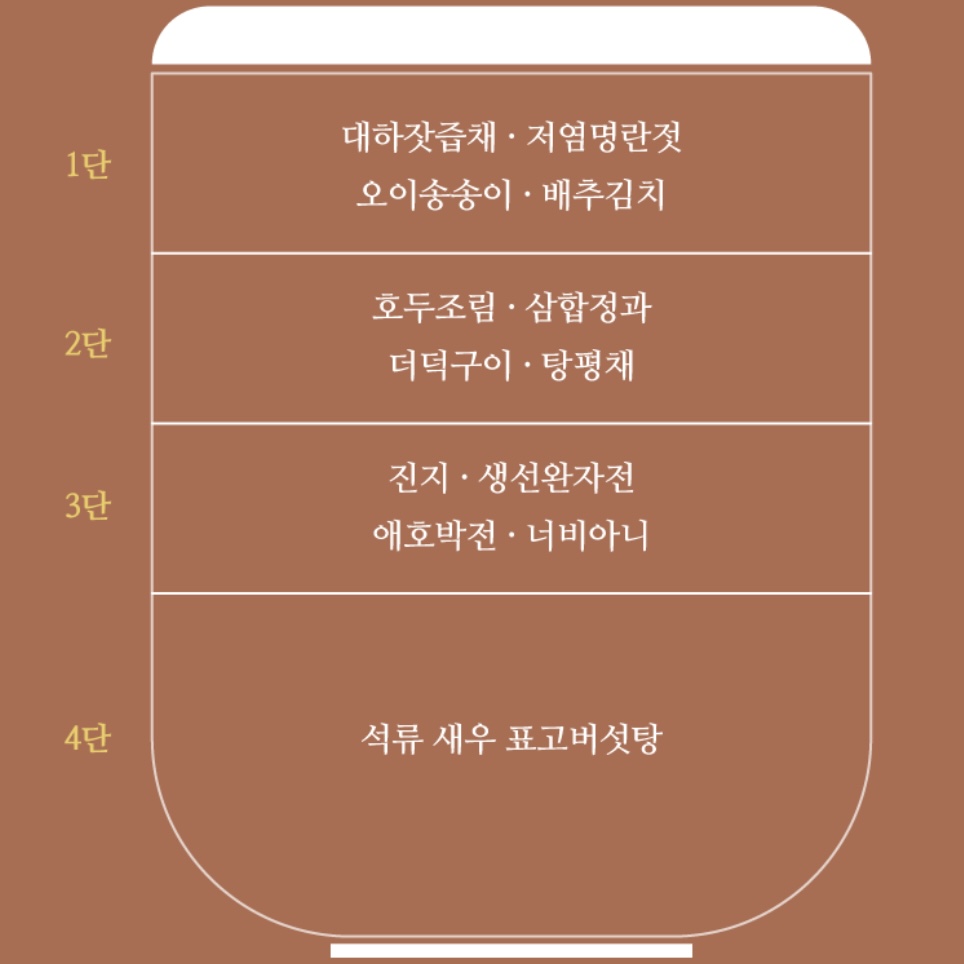‘도슭’은 도시락의 옛말로 왕과 왕비에게 올리던 최고의 일상식인 12첩 반상을 현대적으로 해석하여 합에 정갈히 나누어 담아낸 음식입니다.
